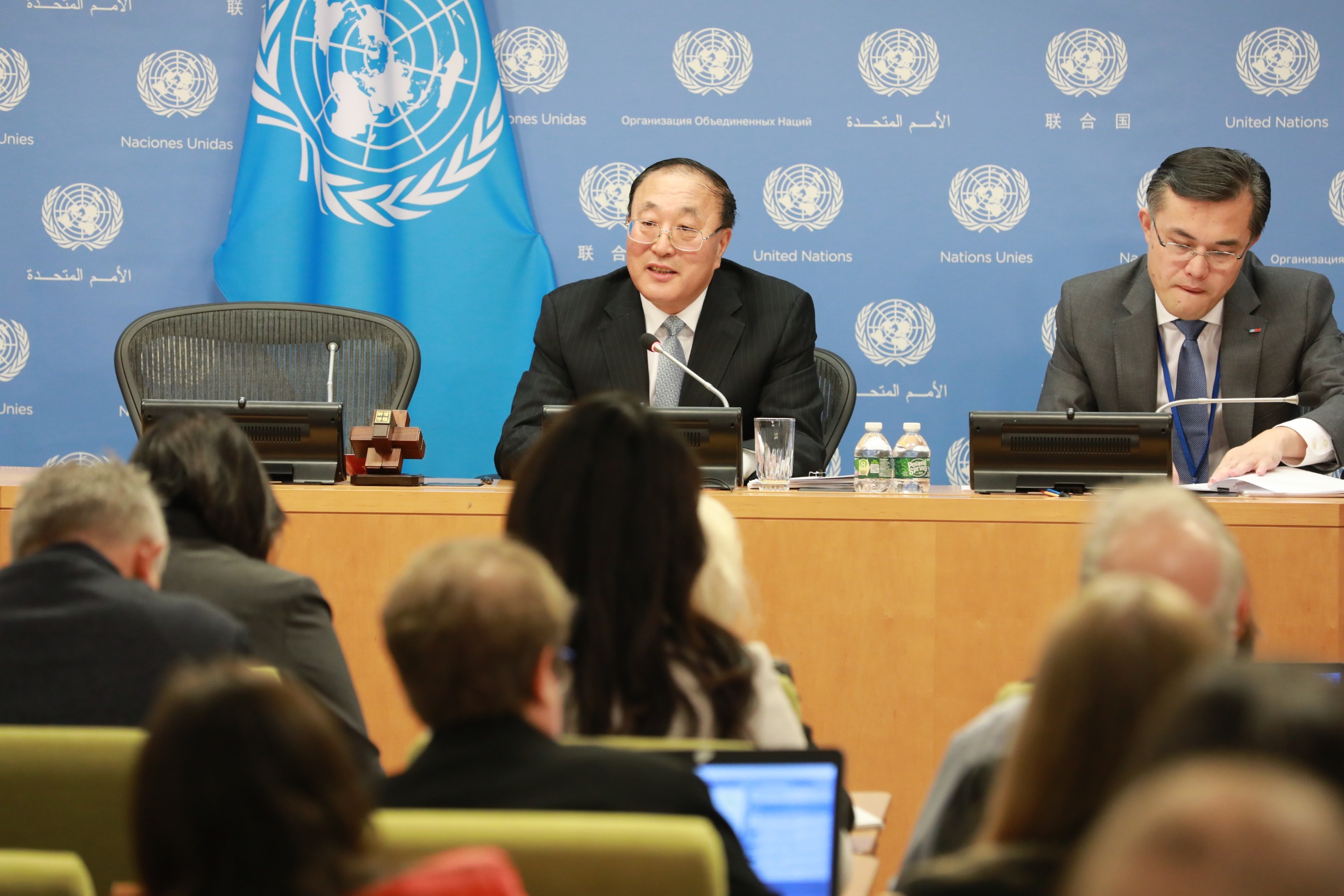 2023年11月1日,在位于紐約的聯(lián)合國(guó)總部,中國(guó)常駐聯(lián)合國(guó)代表張軍(左)在媒體吹風(fēng)會(huì)上講話。新華社記者 謝鍔 攝