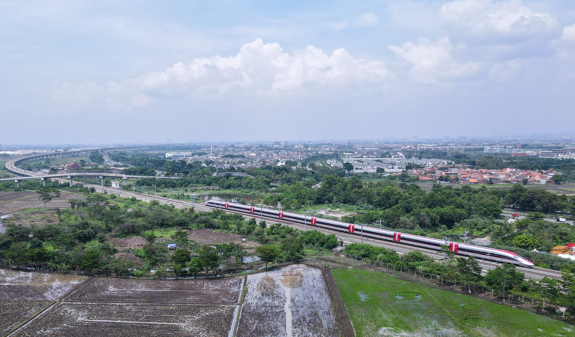 這是2023年12月6日在印度尼西亞萬(wàn)隆德卡魯爾車站附近拍攝的一列行駛中的雅萬(wàn)高鐵高速動(dòng)車組(無(wú)人機(jī)照片)。新華社記者 徐欽 攝