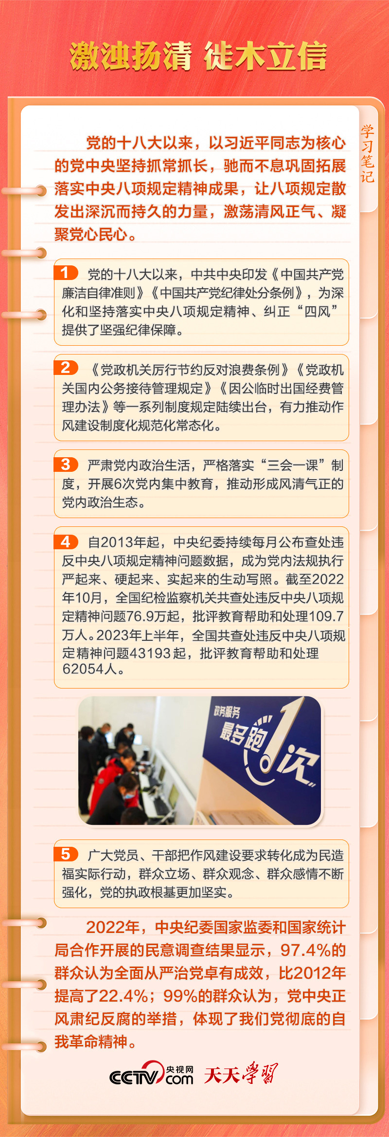 天天學(xué)習(xí)在二十屆中央紀(jì)委二次全會上,習(xí)近平總書記指出:“制定實(shí)施中央八項(xiàng)規(guī)定,是我們黨在新時代的徙木立信之舉,必須常抓不懈、久久為功,直至真正化風(fēng)成俗,以優(yōu)良黨風(fēng)引領(lǐng)社風(fēng)民風(fēng)。”