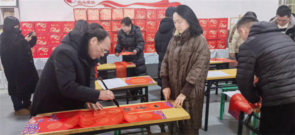 在主委張紅晨的帶領(lǐng)下,盟員、嶺南書畫院院長(zhǎng)寧學(xué)明,盟員、省美術(shù)家協(xié)會(huì)創(chuàng)評(píng)部主任、《陜西美術(shù)》雜志執(zhí)行主編解詩(shī)梵等六名書法家在現(xiàn)場(chǎng)揮毫潑墨,一行行俊逸的書法,揮灑在一張張喜慶的紅紙上,濃濃的年味濃縮于一筆一劃之間,一副副飽含寓意和喜慶的春聯(lián),將真誠(chéng)的祝福帶給一線快遞小哥們。