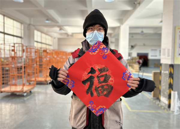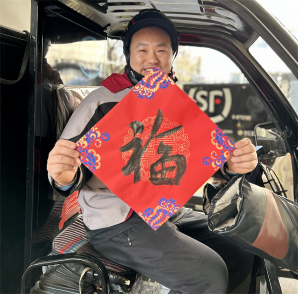 活動(dòng)中書法家們通過(guò)寫春聯(lián)、寫福字的方式,為辛勤奮斗、守護(hù)美好生活“最后一公里”的一線快遞小哥們送來(lái)有溫度、有分量的“文化年貨”,送上節(jié)日的祝福和問(wèn)候。讓春節(jié)堅(jiān)守崗位的快遞小哥們?cè)诠ぷ鞯馗惺艿絹?lái)自社會(huì)的關(guān)心關(guān)愛和濃濃的節(jié)日氛圍;讓返鄉(xiāng)過(guò)年的小哥們把書法家們親筆書寫的福字和福氣帶回家,把溫暖快遞回家。