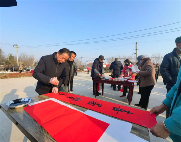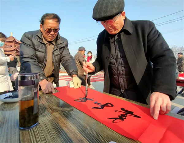 書法家協(xié)會的數(shù)位書法家揮毫潑墨,將濃濃新春祝福凝在筆端,為村民免費書寫、贈送新春對聯(lián)。村中心廣場上,鑼鼓聲聲震天響,火紅的扇子舞動翩翩,男女老少紛紛沉浸在喜慶的活動氛圍中。
