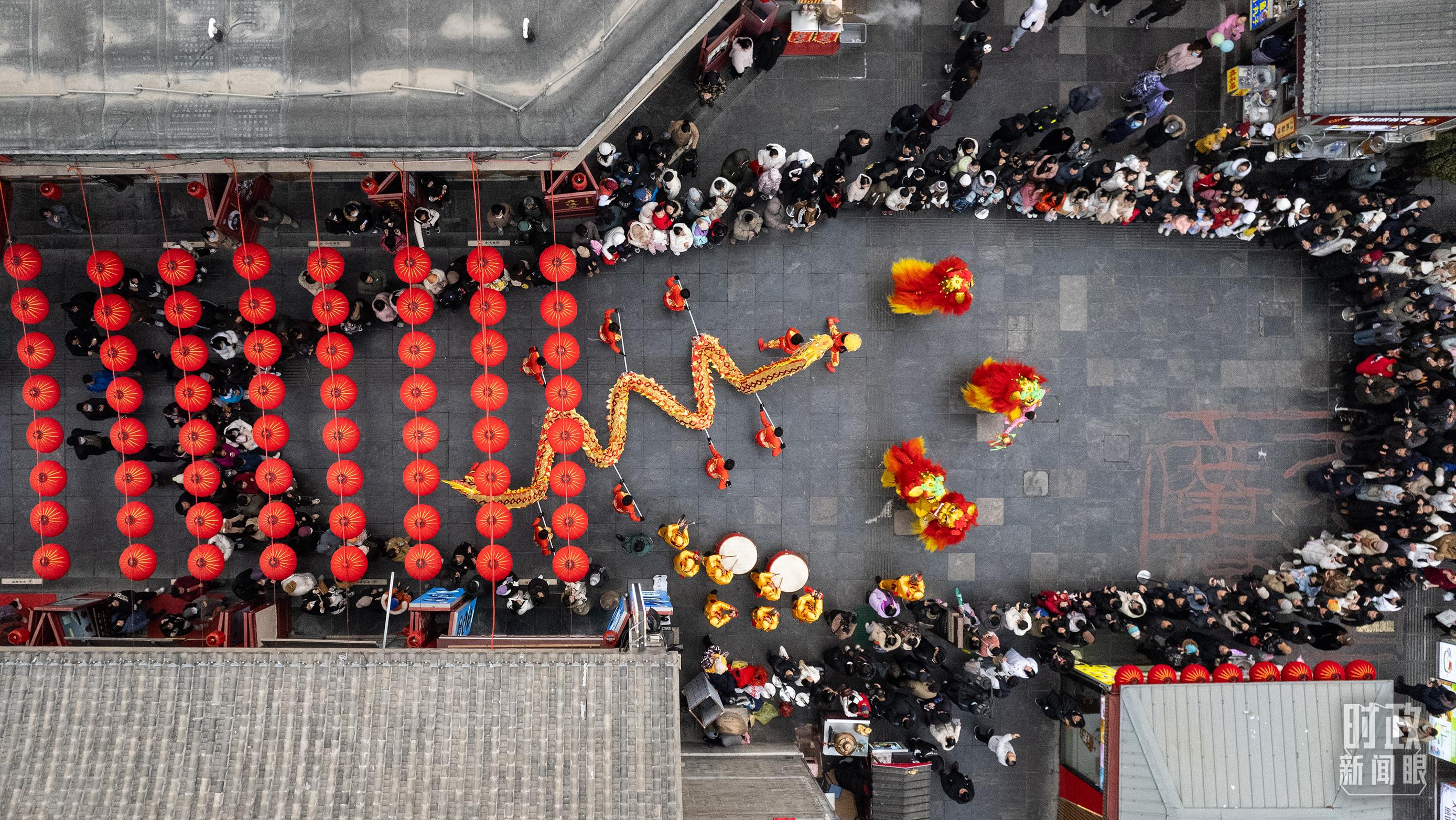 △天津古文化街上的舞龍舞獅表演,喜氣騰騰。(總臺(tái)國(guó)廣記者李晉拍攝)