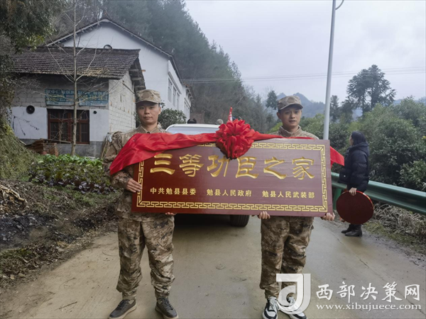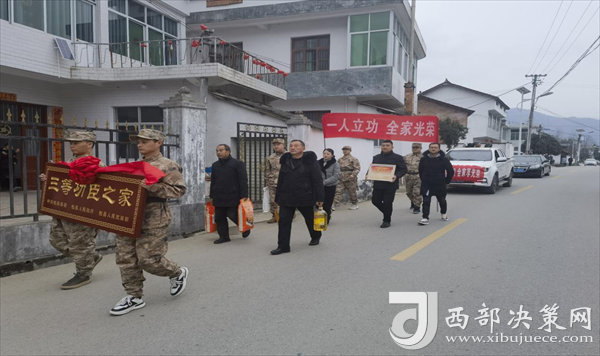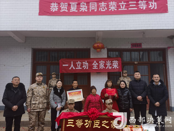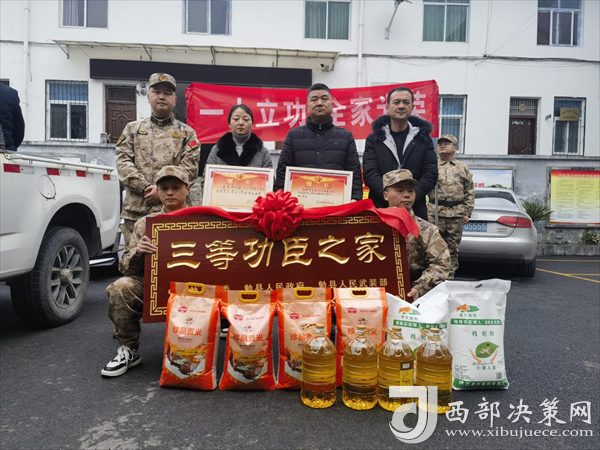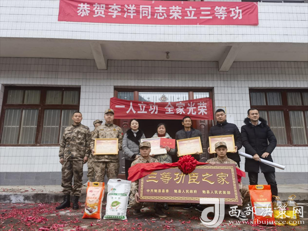 西部決策網(wǎng)訊 喜報(bào)送到家,榮譽(yù)獻(xiàn)功臣。春節(jié)前夕,現(xiàn)役軍人李洋、夏梟和他的家人收到了一份特殊的“禮物”。勉縣退役軍人事務(wù)局、阜川鎮(zhèn)主要領(lǐng)導(dǎo)、鎮(zhèn)人武部和鎮(zhèn)退役軍人服務(wù)站及村“兩委”有關(guān)負(fù)責(zé)人,專程將立功喜報(bào)、三等功臣之家牌匾送到李洋、夏梟的家中,為他送上榮譽(yù)和祝福。