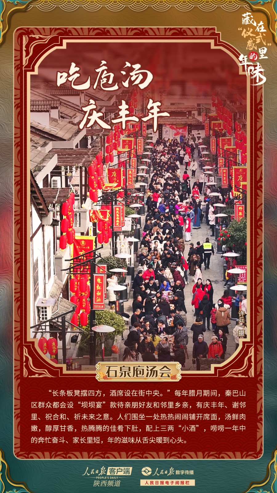 賞盛世花燈、逛特色廟會、看火熱“村晚”,人們在沉浸式、有滋味的豐富體驗中獲得節(jié)日飽滿的情緒價值;男女老少、家家戶戶擺上長桌圍坐一處“吃庖湯”,在熱熱鬧鬧的舉杯相慶中,讓陜西的“吃席”文化拉滿春節(jié)的節(jié)日氣氛;長輩們給小娃娃掛上象征吉祥如意的“棗牌牌”,從土地里結出的紅棗子、生長出的谷草秸,包裹著心意滿滿的溫暖寄望,也蘊含著鄉(xiāng)土中國的深沉情結......