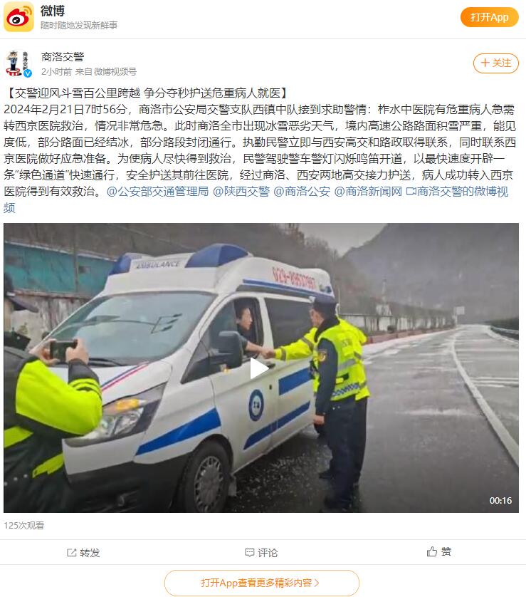 2024年2月21日7時56分,商洛市公安局交警支隊西鎮(zhèn)中隊接到求助警情:柞水中醫(yī)院有危重病人急需轉西京醫(yī)院救治,情況非常危急。此時商洛全市出現(xiàn)冰雪惡劣天氣,境內高速公路路面積雪嚴重,能見度低,部分路面已經結冰,部分路段封閉通行。執(zhí)勤民警立即與西安高交和路政取得聯(lián)系,同時聯(lián)系西京醫(yī)院做好應急準備。為使病人盡快得到救治,民警駕駛警車警燈閃爍鳴笛開道,以最快速度開辟一條“綠色通道”快速通行,安全護送其前往醫(yī)院,經過商洛、西安兩地高交接力護送,病人成功轉入西京醫(yī)院得到有效救治。