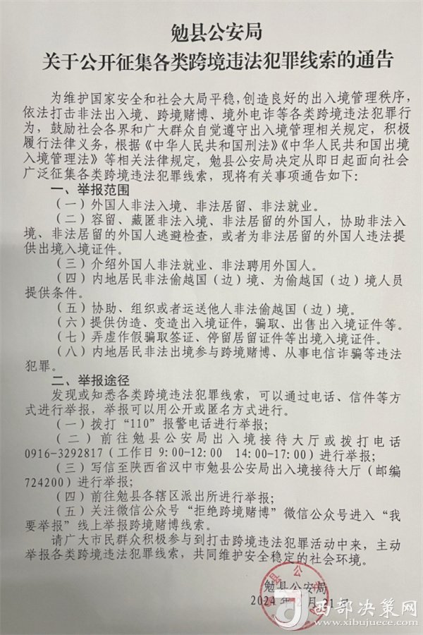 西部決策網(wǎng)訊 為維護(hù)國(guó)家安全和社會(huì)大局平穩(wěn),創(chuàng)造良好的出入境管理秩序,依法打擊非法出入境、跨境賭博、境外電詐等各類跨境違法犯罪行為,鼓勵(lì)社會(huì)各界和廣大群眾自覺(jué)遵守出入境管理相關(guān)規(guī)定,積極履行法律義務(wù),根據(jù)《中華人民共和國(guó)刑法》《中華人民共和國(guó)出境入境管理法》等相關(guān)法律規(guī)定,勉縣公安局決定從即日起面向社會(huì)廣泛征集各類跨境違法犯罪線索,現(xiàn)將有關(guān)事項(xiàng)通告如下: