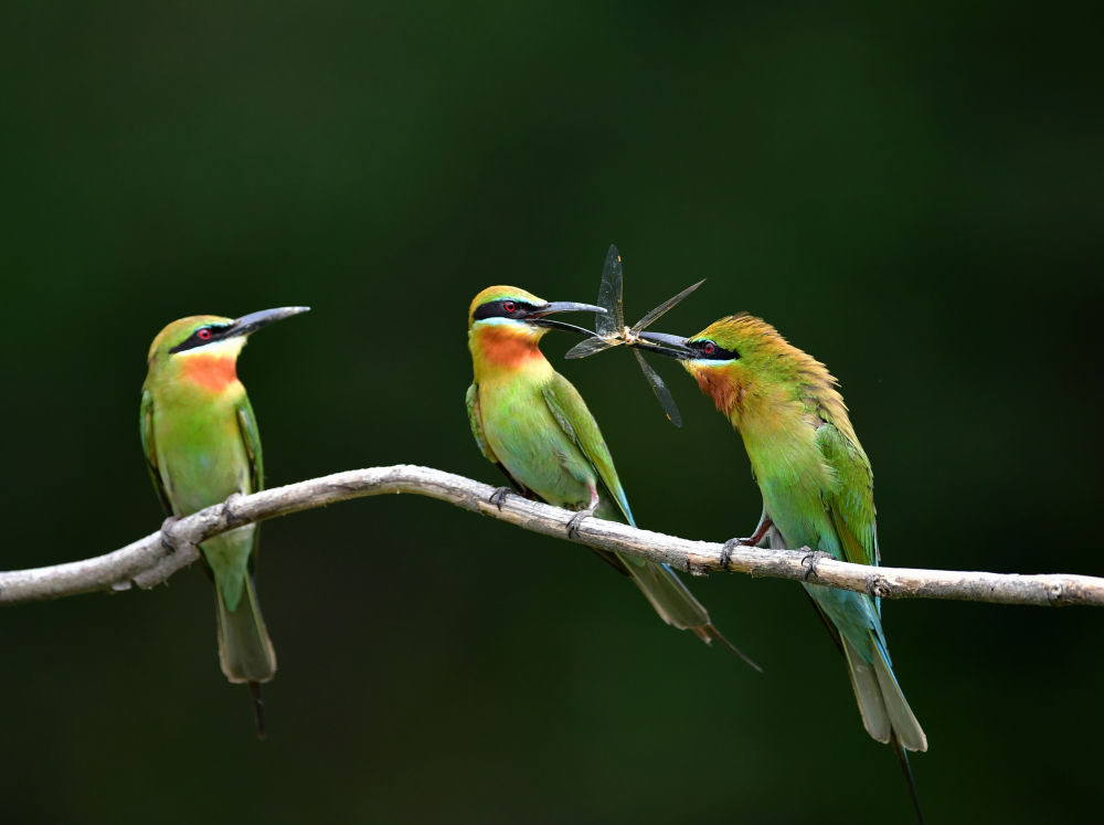 在廈門(mén)五緣灣栗喉蜂虎自然保護(hù)區(qū)騎馬山片區(qū),一只栗喉蜂虎雄鳥(niǎo)(右)給兩只雌鳥(niǎo)喂食昆蟲(chóng)(2023年5月20日攝)。新華社記者 魏培全 攝