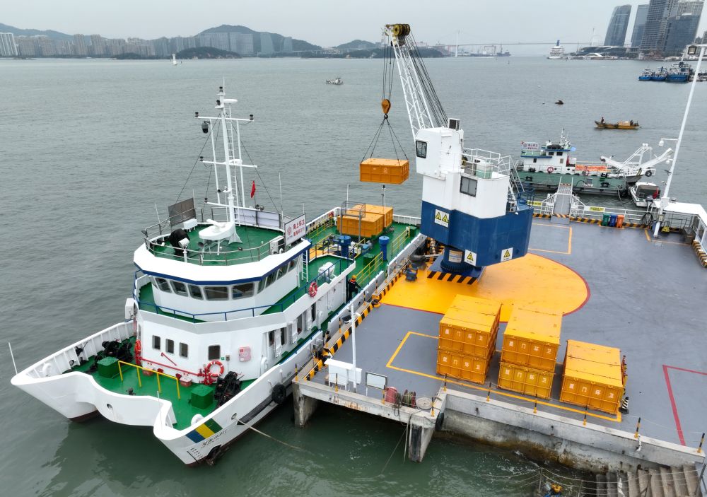 2024年1月25日,工作人員在廈門(mén)西堤海上環(huán)衛(wèi)碼頭吊運(yùn)海漂垃圾(無(wú)人機(jī)照片)。新華社記者 林善傳 攝