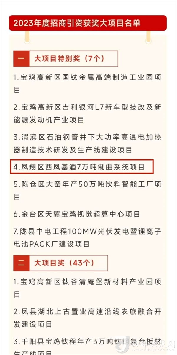 該項(xiàng)目由陜西西鳳酒基酒生產(chǎn)有限公司投資建設(shè),總投資35億元。主要建設(shè)兩座制曲大樓、曲房曲庫、曲糧接收發(fā)放系統(tǒng)及12座筒倉,配套道路、給排水、電力、消防、綠化等基礎(chǔ)設(shè)施。項(xiàng)目建成后,可滿足10萬噸基酒的生產(chǎn)需求,將實(shí)現(xiàn)銷售收入300億元,上繳利稅100億元,將帶動萬余人就業(yè)。