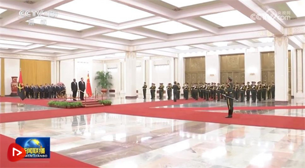 天安門廣場鳴放21響禮炮,禮兵列隊致敬。兩國元首登上檢閱臺,軍樂團奏中安兩國國歌。洛倫索在習近平陪同下檢閱中國人民解放軍儀仗隊,并觀看分列式。