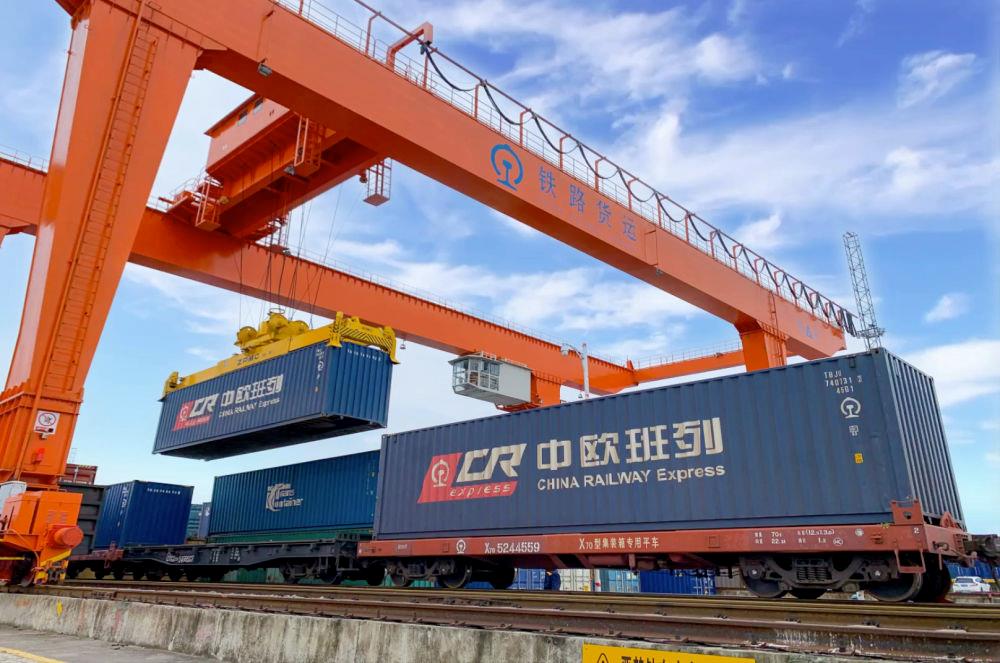 △2022年4月29日,在安徽合肥北站物流基地集裝箱作業(yè)區(qū),準(zhǔn)備發(fā)運(yùn)的中歐班列集裝箱。